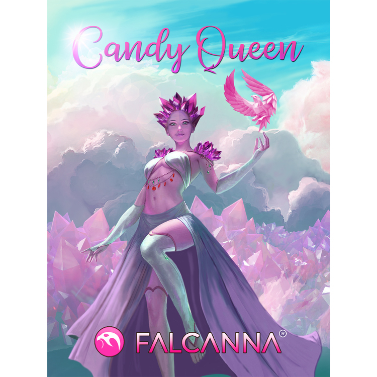 ● 30% Indica / 70% Sativa Candy Queen is a cross Falcanna made between Candy Kush and Space Queen. With hints of hibiscus and fresh cut pears, this relaxing, clear-headed sativa-dominant hybrid emanates chill vibes and seems made for bright days. Offering a mental clarity that enables activity, it also provides a body high that is relaxing without being heavy. This strain both looks and smells deeply of mango and colorful cereal, with a heavy coating of frost and an exhale that is light and sweet. DOH Compliant